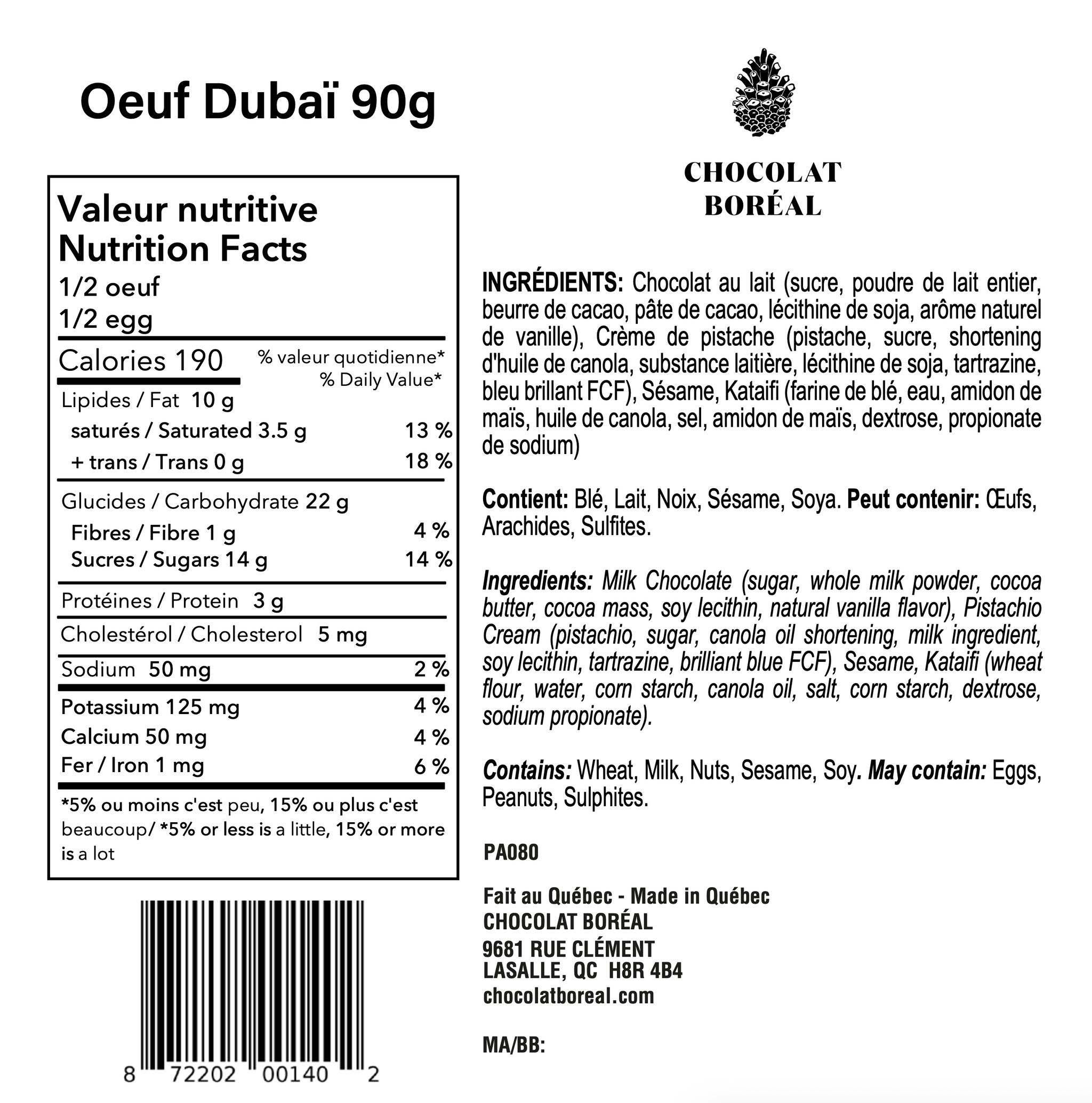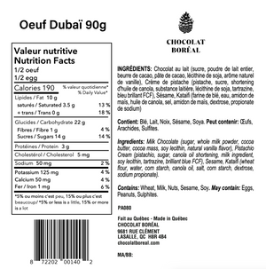 Sous sa coque de chocolat, découvrez une crème de pistache veloutée, subtilement sucrée et pleine de caractère. Un œuf d’exception, à la fois généreux et élégant.