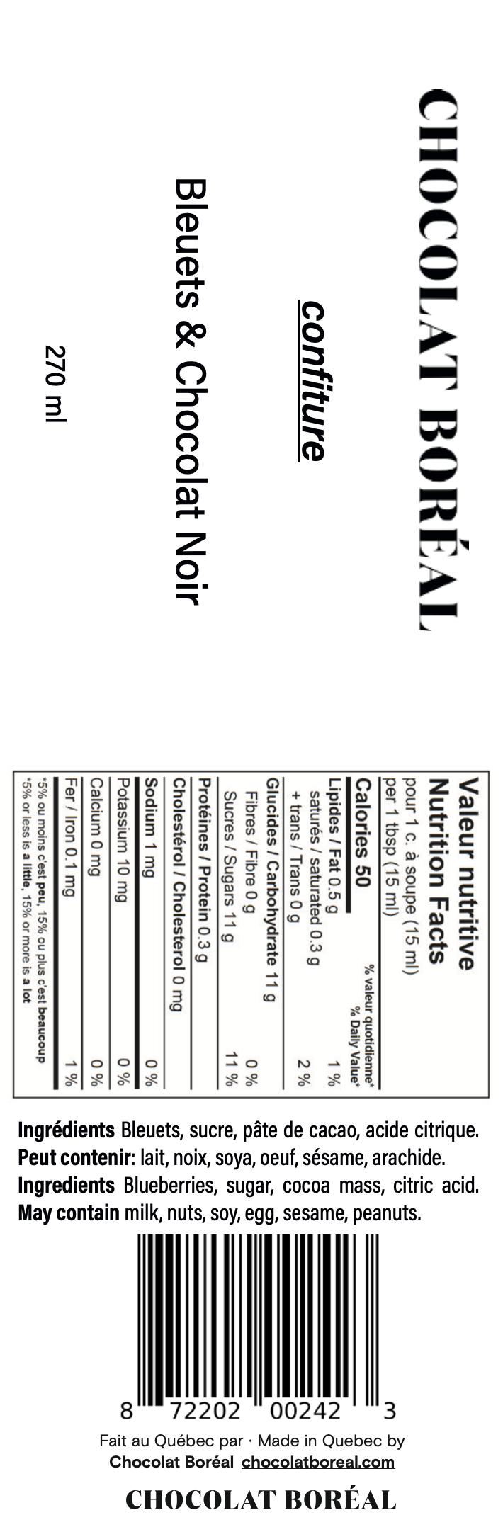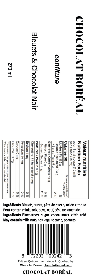Cette confiture maison est cuisinée à partir de bleuets sans-pesticide du Québec et de chocolat noir durable. Un minimum d'ingrédients pour une maximum de saveurs. Vos brunchs seront rehaussés par la présence de ce délice du terroir sur vos tartines, croissants, muffins et crêpes.