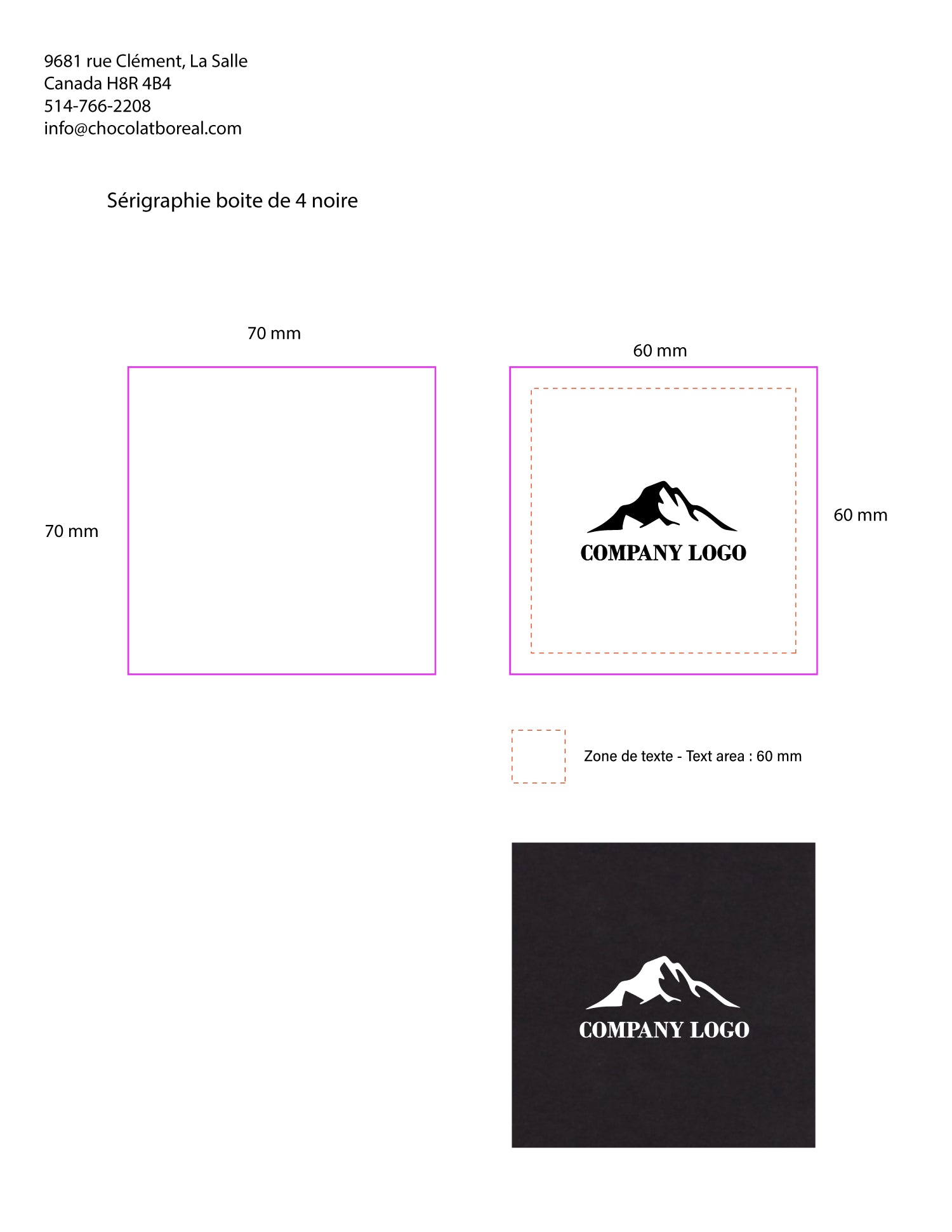 Cette boîte de 4 chocolats peut être personnalisée par une impression directe de votre logo sur le dessus de la boîte, réalisée en sérigraphie. Vous avez le choix entre une impression or, argent, blanche, ou une boîte sans impression pour un rendu plus épuré.