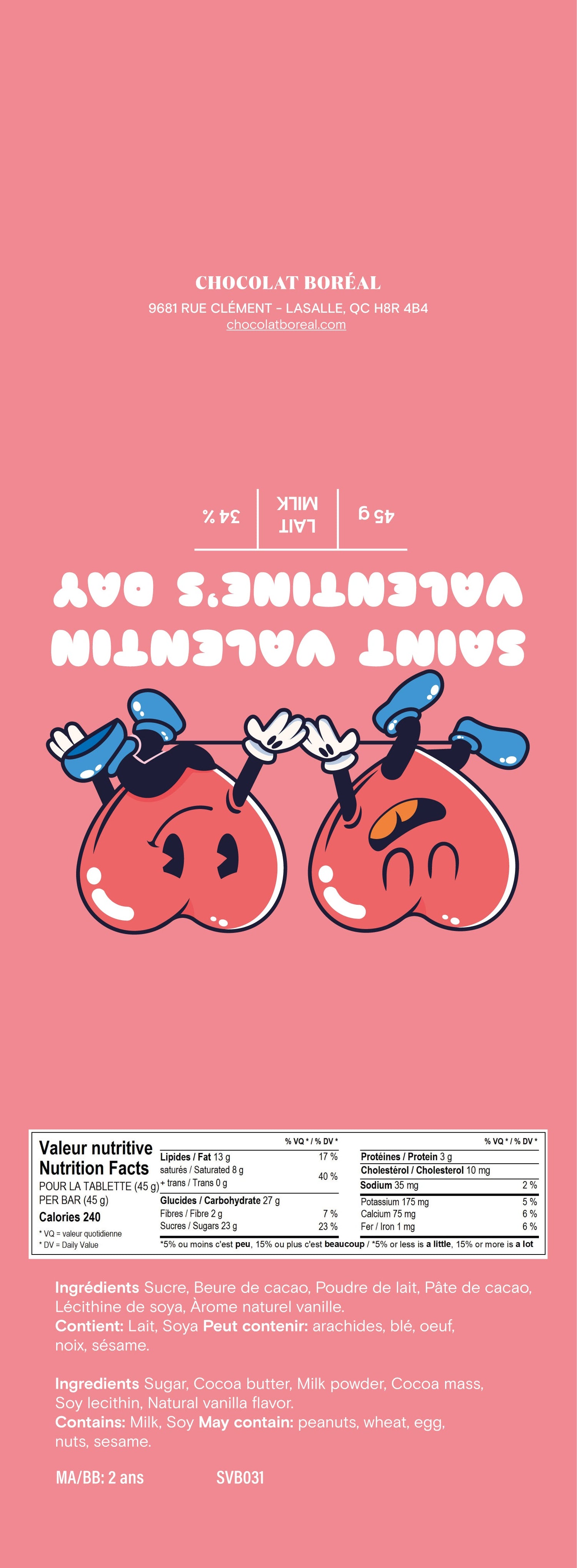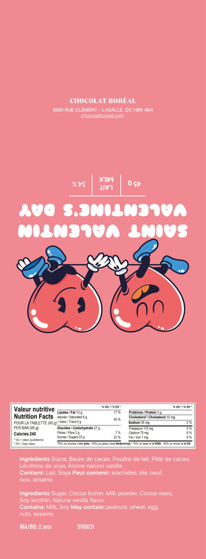 Notre tablette de chocolat Saint-Valentin incarne l'amour sous toutes ses formes, avec un emballage adorable mettant en scène deux personnages en forme de cœur. Ouvrez ce trésor sucré pour dévoiler une symphonie de saveurs qui réchauffera votre cœur et celui de votre bien-aimé(e). Un délice à partager avec passion.